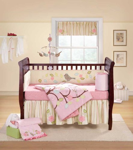 Features: -Set includes comforter, crib sheet, bumper and dust ruffle. -Embroidered birds, leaves and flowers in lovely pink and yellow tones. -Love Bird collection. -Love Bird collection -Machine wash cold, delicate cycle. Wash each item separately. Tumble dry low. Warm iron if needed.